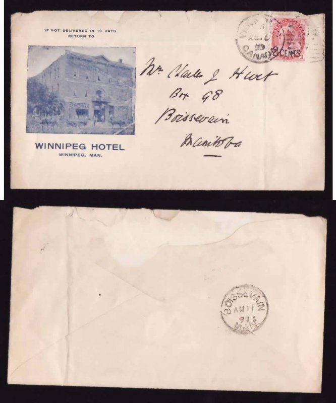 #13594-2c on 3c Numeral-Hotel advertising-Winnipeg-Au 10 1899-rough opening at top-vertical fold line through cancel, not stamp- Member of the Canadi...