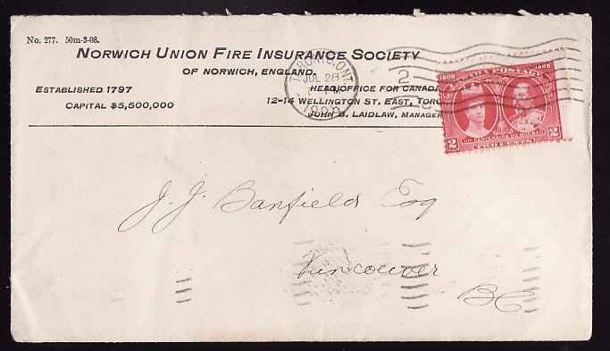 #13596-2c Tercentenary-Toronto Ont-Jul 28 1908-CC Norwich Union Fire Insurance-Member of the Canadian Stamp Dealers Association and have been serving ...