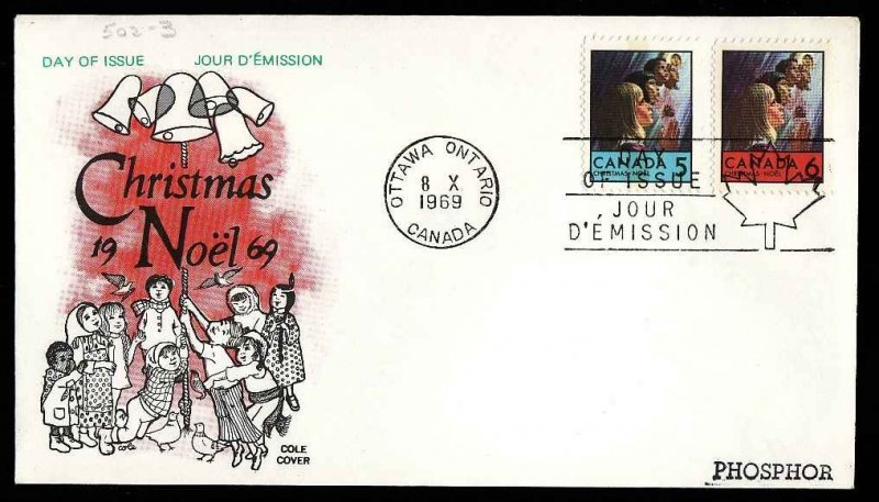 #13689 - 5c & 6c Winnipeg Tagged [ #502p-3p ] Christmas [ Children Praying] on cachet First Day Cover - Carleton County - Ottawa, Ont - 8 10 1969 - "Cole" cachet