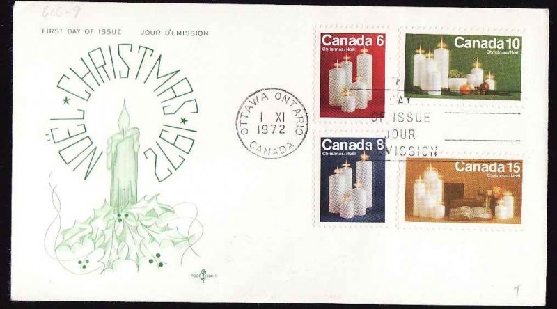 #13692 - 6c,8c,10c & 15c General Tagged [ #606pi-9pi ] Christmas [Candles] on cachet First Day Cover - Carleton County - Ottawa, Ont - 1 11 1972 - "Rose craft" cachet maker Canadian Stamp Dealers Association and have been serving the collector since 1975.