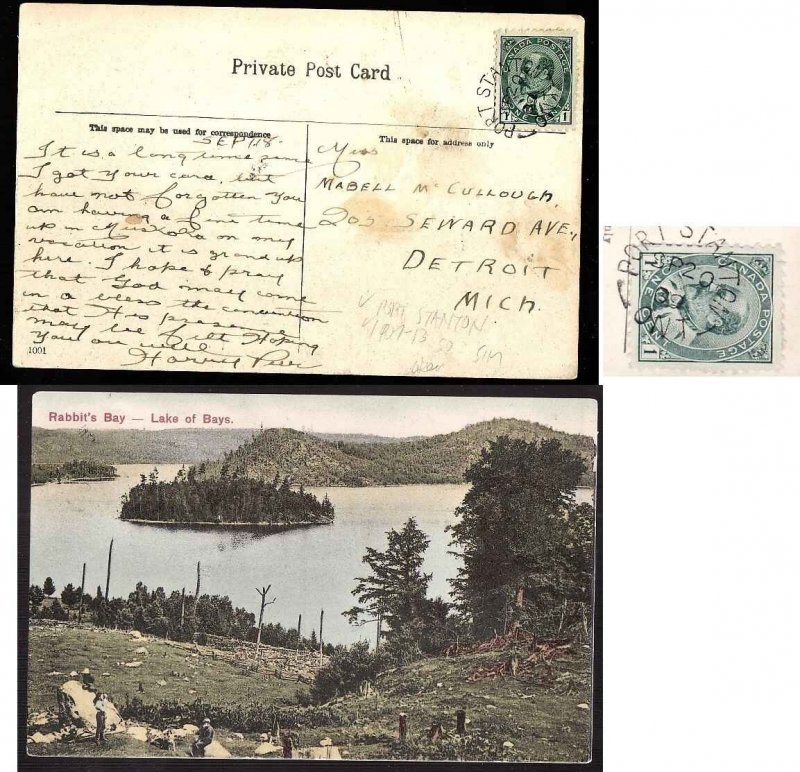 #13868-Canada cover- Simcoe cty-Port Stanton single broken circle-Sp 20 1909-19 mm-new early date ?- Rabbit's Bay,Lake of Bays on backside-Member of t...