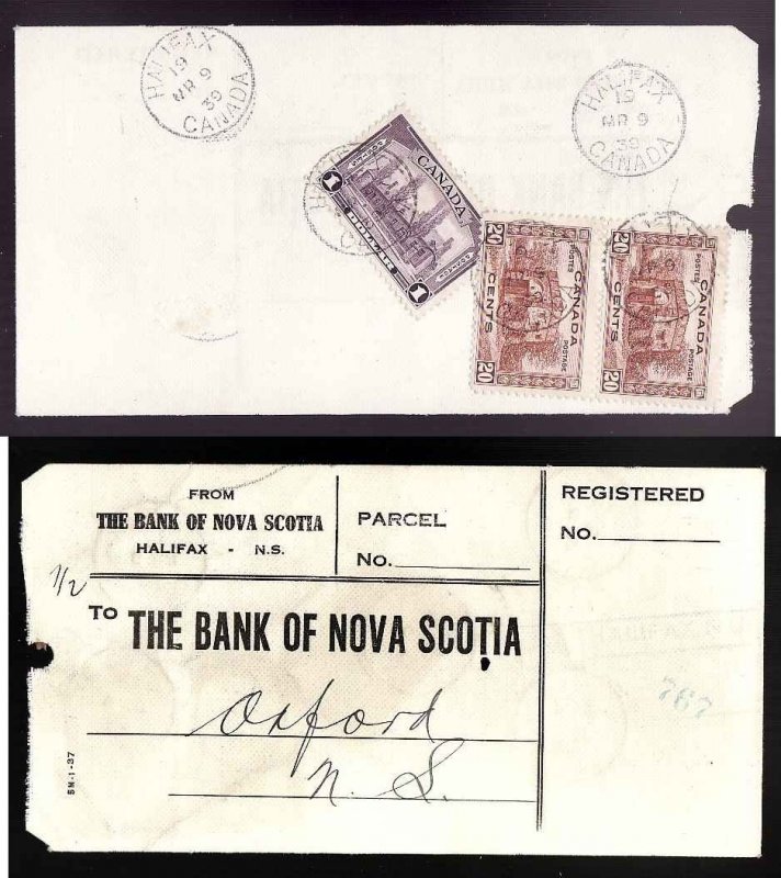#13898 - 20c(2) Fort Garry Gate + $1 Ramezay on Bank of Nova Scotia tag - Halifax,Canada - Mr 8 1939 - to Oxford NS - Insurance fee reflects tracking costs