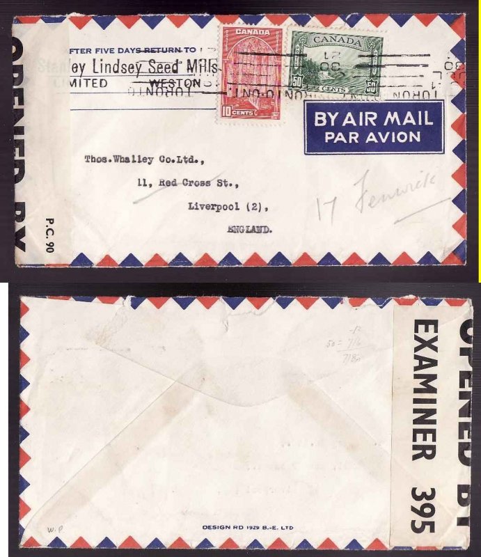 #13901 - 10c Chamber + 50c Vancouver Harbour airmail to England - York County - Toronto, Ont roller - July 30 1941 - re-directed in Liverpool - censor label "Examiner 395 " - 60c franking pays double the airmail rate to England