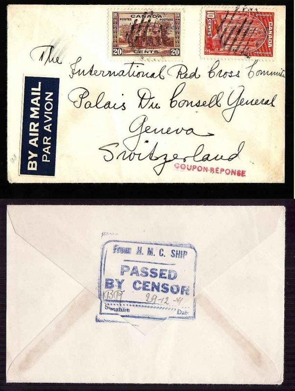 #13914 - 20c Fort Garry Gate + 10c Chambers airmail to Red Cross Committee, Geneva, Switzerland - From HMC Ship / Passed by Censor / 29-12-1941 - "Coupon-Reponse" - envelope contained a coupon to be given to a POW so mail could be sent to Canada -