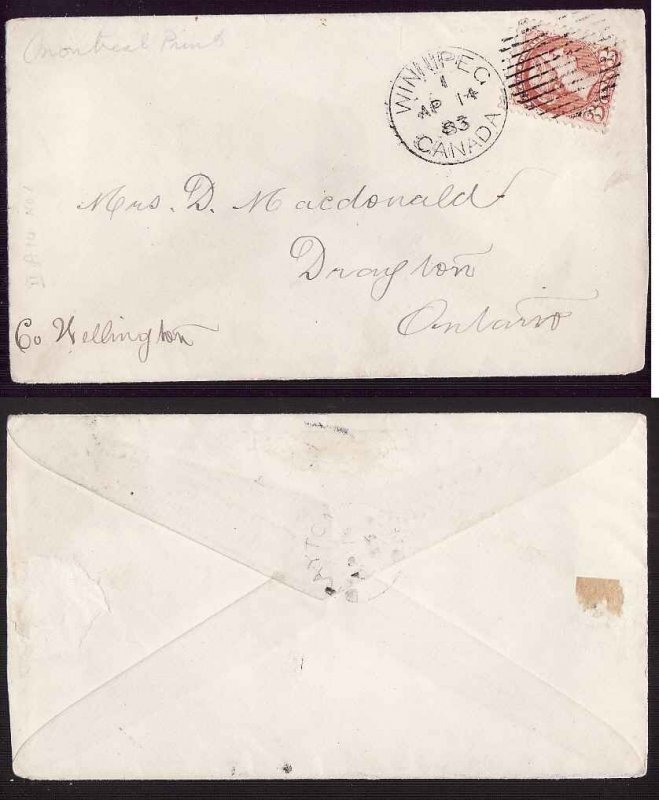 #13932 - 3c Small Queen-Winnipeg,Man duplex-Ap 14 1883-receiving mark-Wellington County-Drayton,Ont single broken circle-Ap 16 1883 [ new early date ? ]