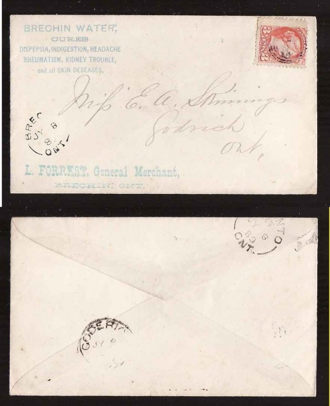 #13933 - 3c Small Queen-Ontario Cnty-Brechin,Ont single broken circle-Jy 8 1880-CC "Brechin Water Cures"-Member of the Canadian Stamp Dealers Associat...