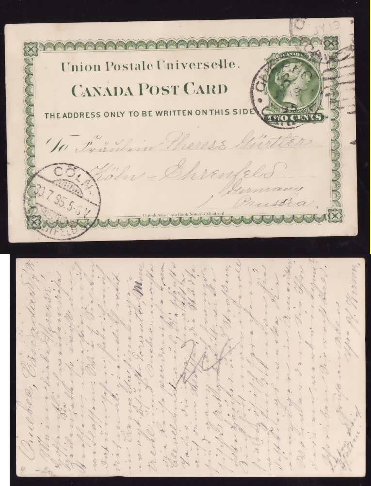 #13967-2c UPU card-Quebec-Jy 19 1895-to Germany-receiving-Coln 30.7.95-Member of the Canadian Stamp Dealers Association and have been serving the coll...