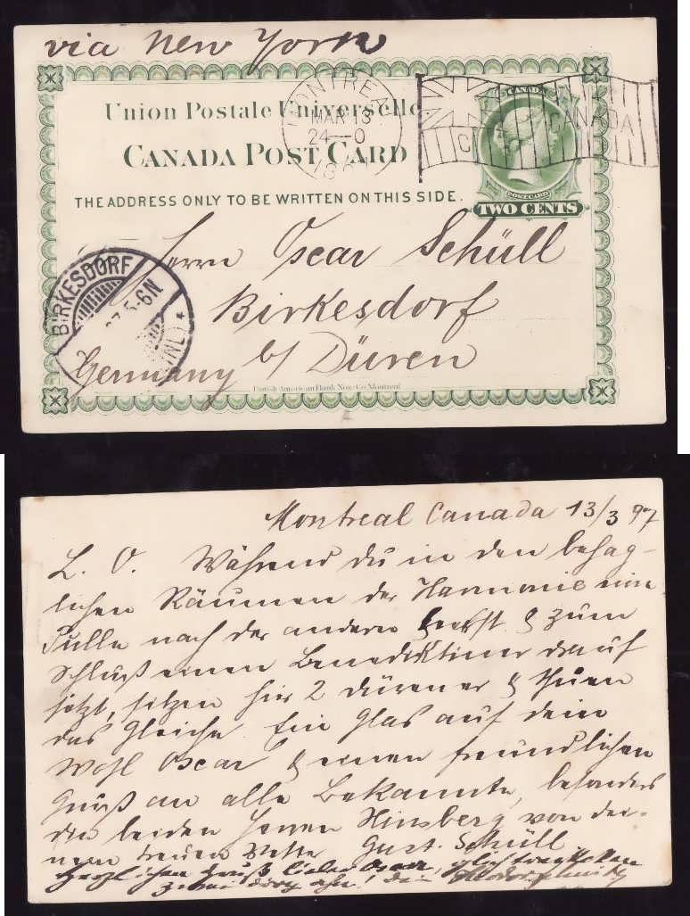 #13970-2c UPU card-Montreal- flag 1-4-Mar 13 1897-Germany-Birkesdorf receiving-Member of the Canadian Stamp Dealers Association and have been serving ...