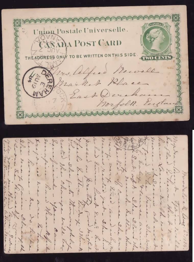 #13976-2c UPU-Woodstock,Ont-Au 7 1884-England-Dereham Au 19 1884-Member of the Canadian Stamp Dealers Association and have been serving the collector ...