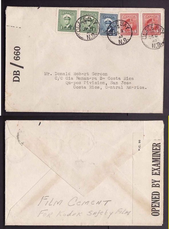 Canada-cover #14009 - 1c(2)+ 4c(2)+ 5c(corner pulled) KGVI war to Costa Rica, Central America - Glace Bay,NS - De 2 1943 - censor label - 15c franking pays multiple UPU preferred letter rate 3c + 2c for each additional ounce - M/S on back "Film Cement for Kodak Safety Film" -