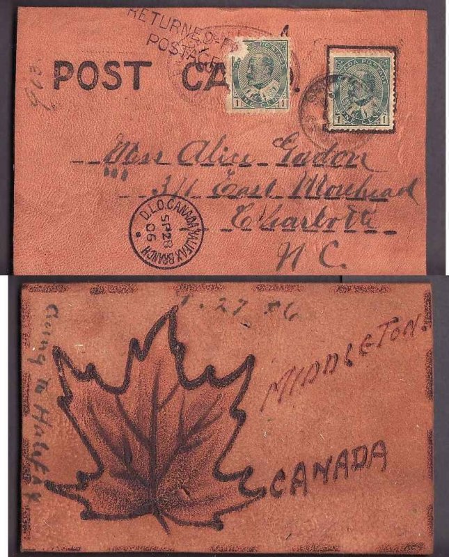 #14078 - 1c Numeral on leather p/c to USA-?, NS-Sp 27 1906-letter rated-H/S "DLO Canada Halifax Branch-Sp 28 1906"-"Returned For Postage"-1cNumeral added & cancelled "Branch DLO Office Halifax"-Oct 8 1906-