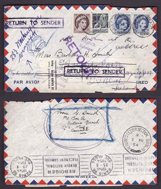 #14082 - 4c Walrus+1c+5c(2) Wilding on airmail to France-Victoria Beach,Man-9 Au 1954-B/S Paris 96-23 8 1954-M/S "not known at this address"-LE Grand Hotel in Paris added a new address label for Dublin, Ireland-H/S "Retour", "Return to Sender" 283 Macray Ave, Winnipeg-B/S Returned Letter Section,Dublin-2 XII 1954-