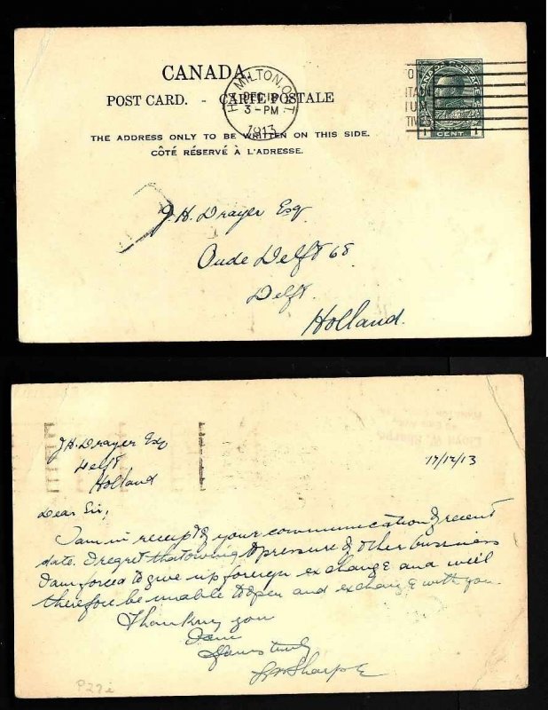 #14322-1c Stationery [P27a]-Holland-Wentworth Cnty-Hamilton,Ont-UL corner bend-Dec 18 1913Member of the Canadian Stamp Dealers Association and have be...