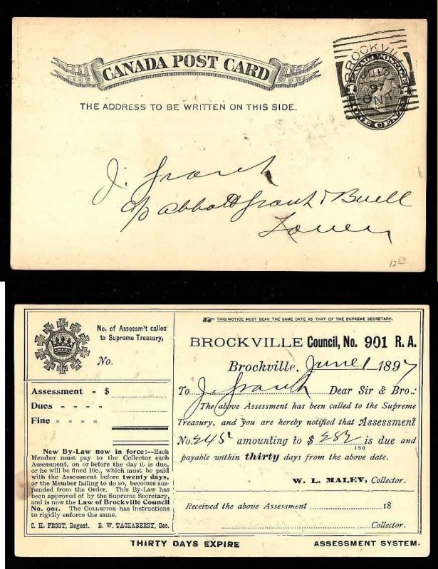 #14324-1c QV p/c-Leeds cnty-Brockville Ont Squared circle-Ju 13 1897-notice of assessment from Brockville Council No 901 RA-Member of the Canadian Sta...