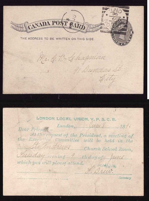 #14326-1c QV p/c-Middlesex cnty-London Ont Squared circle-Ju 9 1896-announcement of meeting of London Local Union Y.P.S.C.E.-London carrier mark-5 PM Ju 9