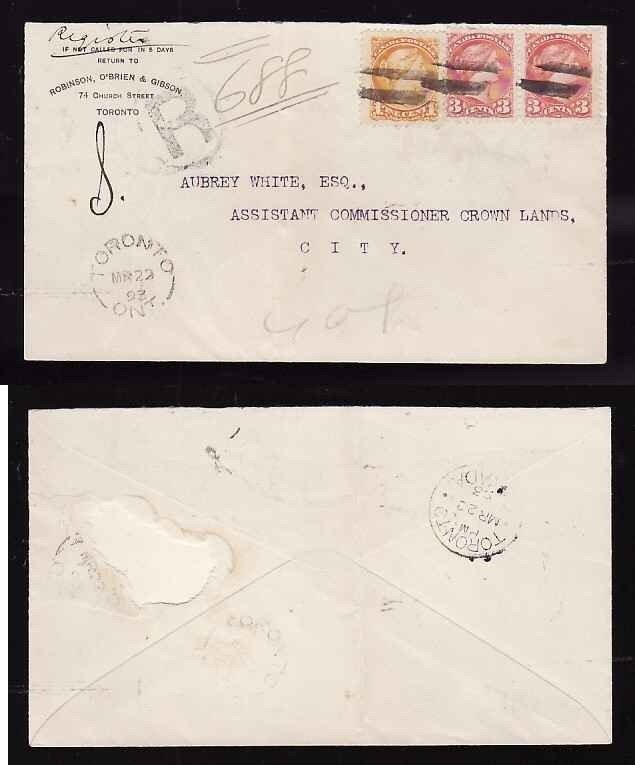 #14331-3c(2)+1c small queens for 7c drop registered free carrier rate-York cnty-Toronto Ont single broken circle-Mr 22 1893-CC Robinson, O'Brien & Gibson- listed price includes coverage for mailing to be tracked by Canada Post-vertical fold line down centre-not affecting stamps-