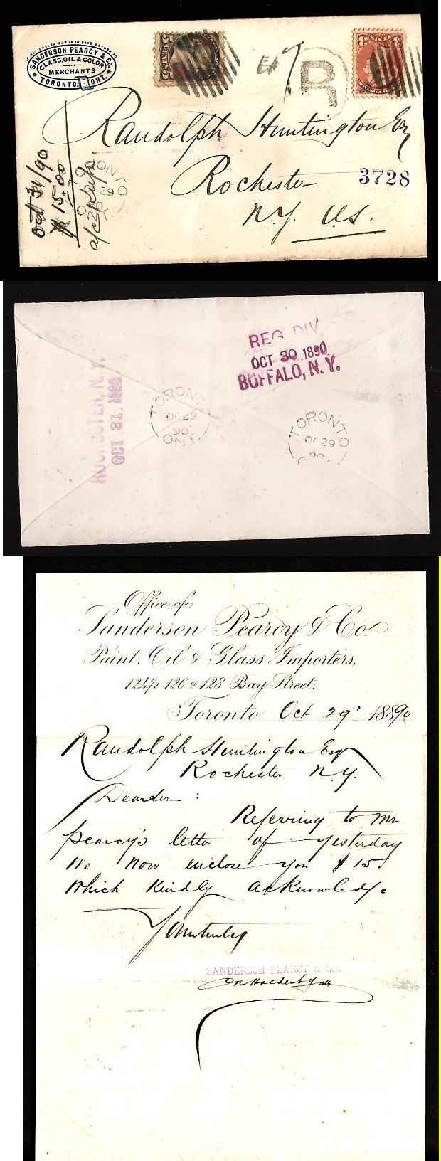 #14335-3c+5c small queens for 8c registered rate-York Cnty-Toronto, Ont single broken circle-Oc 29 1890-CC Sanderson Pearcy & Co-Letter included- Mem...