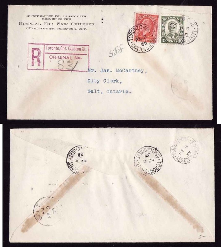 #14347-10c Cartier+3c KGV-reg'd-Toronto,Ont Carlton St-Fe 8 1935-CC Hospital for Sick Children- Member of the Canadian Stamp Dealers Association and ...