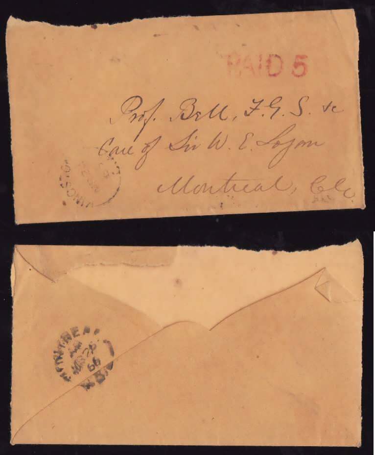 #14379-Stampless-Kingston,CW-Mr 24 1866-"PAID 5" [red]-addressee Robert Bell-Back flap missing-B/S Montreal-Mr 26 1866-Member of the Canadian Stamp De...