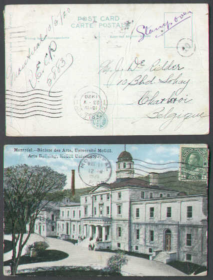 #4427 - 1c Admiral on p/c-Montreal,PQ-May 11 1920-1c UPU printed matter[no message]rate to Belgium -receiving cancel Charleroy-23 V 1920