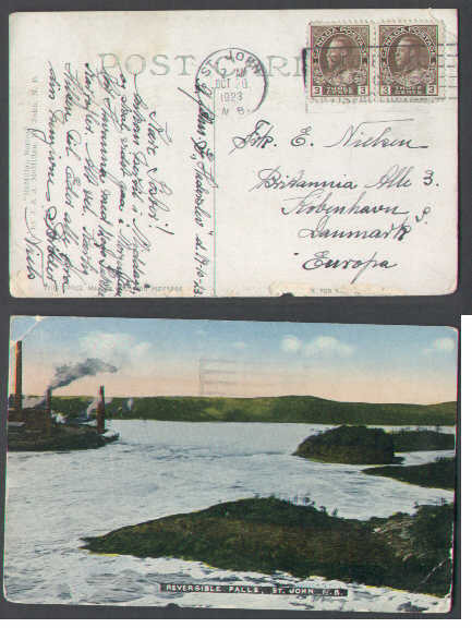 #4432-3c (2) Admiral-p/c-St John, NB-Oct 20 1923- 6c UPU p/c rate to Denmark - uncommon rate used in period - some scuffing along bottom of card-