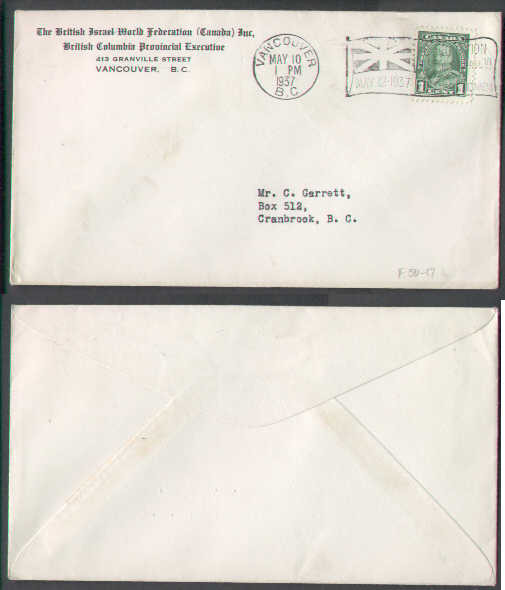 #4496 - 1c KGV pictorial - Vancouver , BC - My 10 1937 - CC "The British Israel World Federation (Canada) Inc" - 1937 Coronation Flag slogan