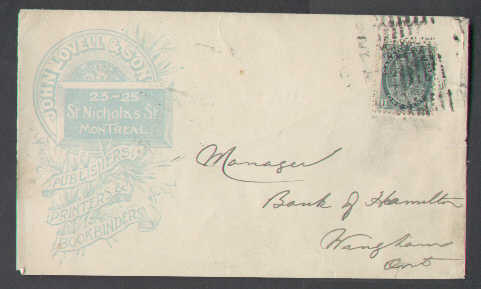 #4596 -1c Numeral (front only)- Montreal roller cancel - illustrated advertising for John Lovell & Son publisher printers & bookbinders -Member of the...