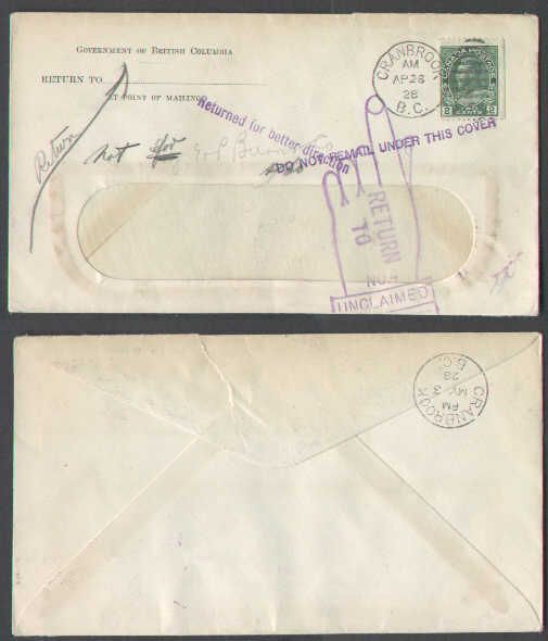 #4640-2c Admiral(booklet stamp)-Cranbrook,BC-Ap 26 1928-B/S Cranbrook My 3 1928- H/S "Returned for better direction","Do not remail under this cover",finger pointed "Return to,Unclaimed",M/S "Return","Not for"