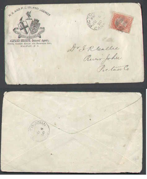 #4690-3c Small Queen-Pictou,NS-Ju 6 1890-Illustrated advertising-Alfred Shortt-Fire Insurance-NS and PEI Agency-Member of the Canadian Stamp Dealers A...