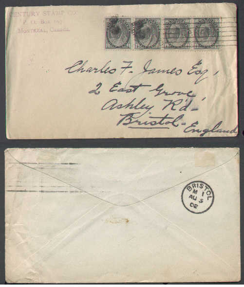 #4999 - 1/2c(4) Numeral-Montreal-Jul ? 1902-franking pays the 2c Empire letter rate to England - CC "Century Stamp Co. PO Box 197 Montreal"Member of t...