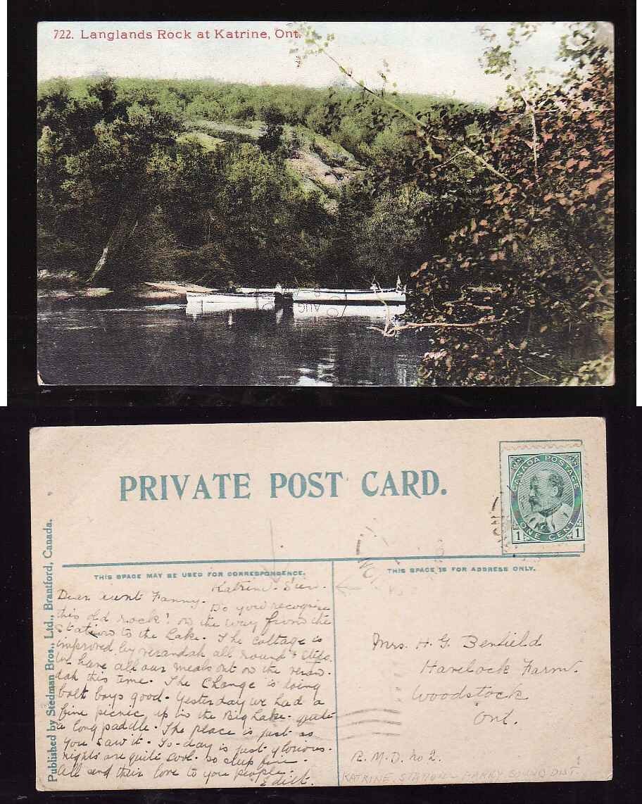 #5018-1c Edward on p/c-partial Katrine Station single broken circle-view of Langlands Rock at Katrine Ont.-Member of the Canadian Stamp Dealers Assoc...