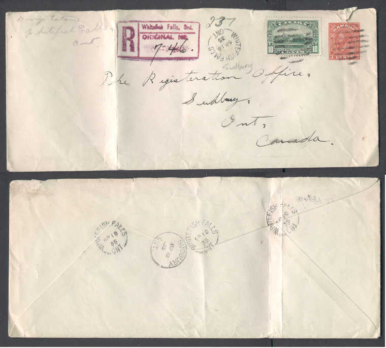 #5069 - 3c KGV postal stationery + 10c Windsor Castle registered - Sudbury District - Whitefish Falls , Ont - Sp 10 1935Member of the Canadian Stamp D...