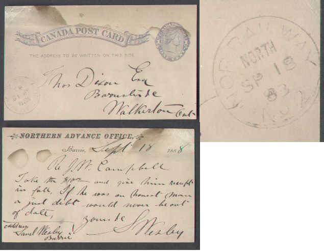 #5224 -1c QV p/c-NOR Railway/No.2 [ RR 110 RF 270 ]-North/Sp18/1888 - card is stained at top- Member of the Canadian Stamp Dealers Association and ha...