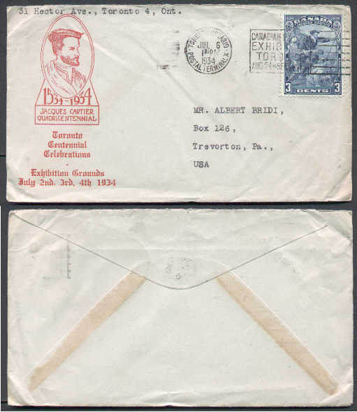 #5552 - 3c Cartier-Jacques Cartier quadricentennial/Toronto centennial cachet-Toronto,Ont-Jul 6 1934Member of the Canadian Stamp Dealers Association a...