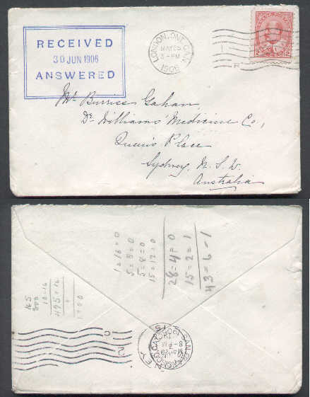 #5595 - 2c Edward to Australia-London,Ont-May 25 1906-2c franking pays the British Empire letter rate to Australia-receiving B/S San Francisco May 29 1906, Sydney Jun 29 1906-