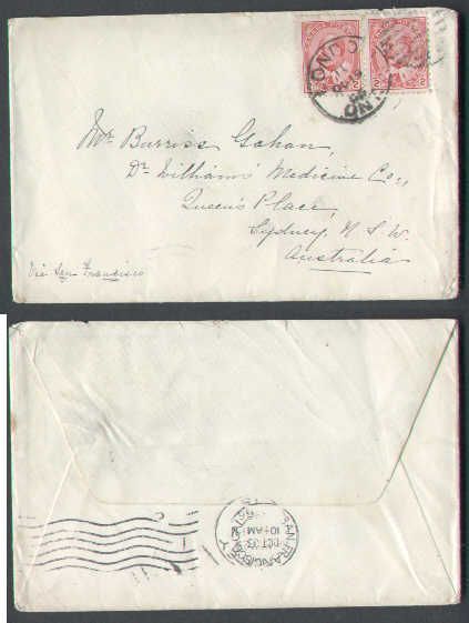 #5596-2c(2)Edward to Australia-London,Ont-Oc 19 1906-4c franking pays the British Empire double weight letter rate to Australia-M/S "via San Francisco"-B/S San Francisco Oc 23 1906,Sydney Nov 24 1906