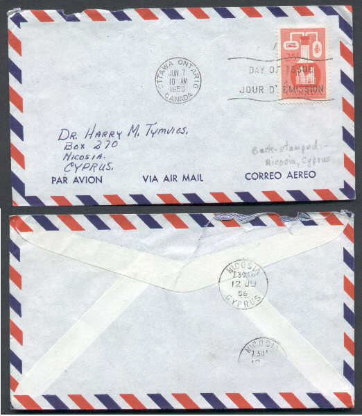 Canada-cover #5600- 25c Chemical [single franking- unusual] airmail- Cyprus-Ottawa Ont -Jun 7 1956- B/S - Nicosia receiving 12 Ju 1956 Member of the ...