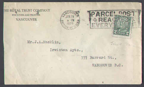 #5705 - 2c drop rate-KGV scroll joint coil[#161]-Vancouver,BC-Jan 29 1929-CC The Royal Trust Company-Member of the Canadian Stamp Dealers Association ...