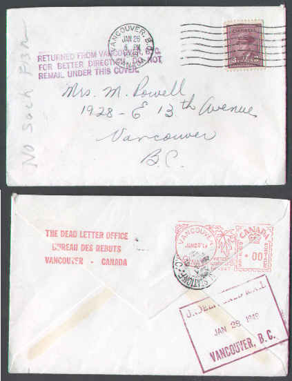 #5798 - 4c KGVI - Vancouver,BC-Jan 26 1949-H/S"Returned from Vancouver BC for better direction do not remail under this cover" - B/S The Dead Letter Office Vancouver BC , Undelivered mail Vancouver BC- DLO slogan meter-
