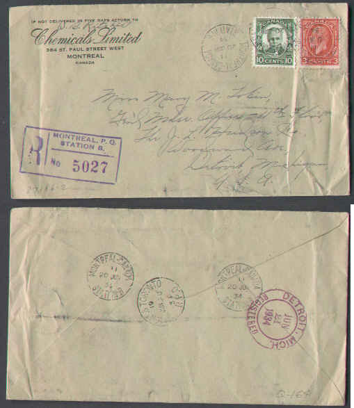 #5968 - 3c KGV Medallion + 10c Cartier registered - Montreal Canada / Station B - 20 Jun 1934- B/S Mont & Toronto RPO [ Q164 RF 75 ]Member of the Ca...