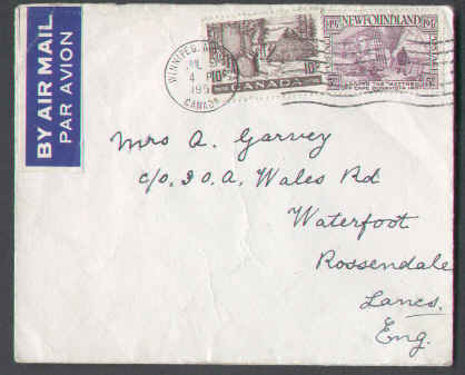 #6046 - 10c Fur + Newfoundland 5c The Matthew - Winnipeg,Man-Jul 9 1951-15c airmail rate to England - Member of the Canadian Stamp Dealers Associatio...