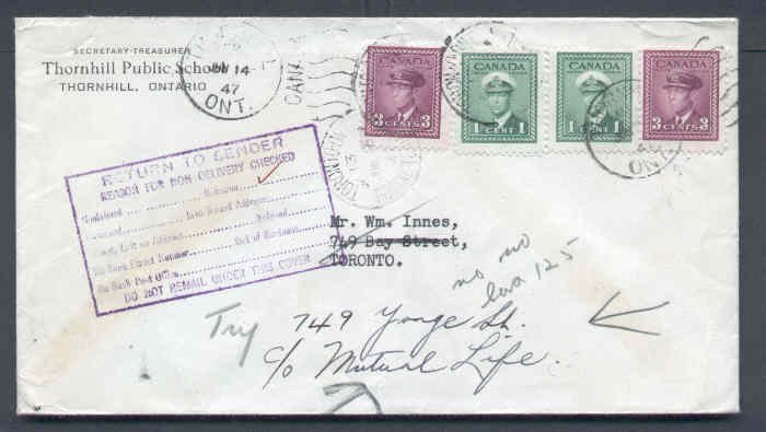 #9754 - 1c(2) + 3c(2) KGVI war - York County - Thornhill , Ont duplex - Jun 14 1947 -8c franking pays the triple domestic letter rate [ 4c + 2c + 2c ] - H/S "Return to Sender"