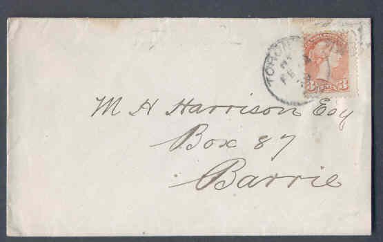 #9773 - 3c Small Queen-York County-Toronto,Ont duplex-AM Fe 12 1879- B/S Barrie , Ont Fe 13 1879 Member of the Canadian Stamp Dealers Association and have been serving the collector since 1975.Canadian buyers - I will cover your GST/HST costs .