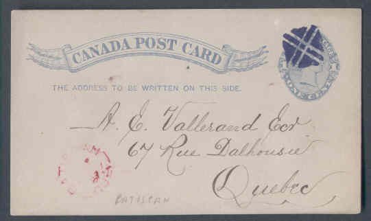 #9782 - 1c QV postcard with fancy cancel-Batiscan,Que single broken circle-21 Sp 1887Member of the Canadian Stamp Dealers Association and have been serving the collector since 1975.Canadian buyers - I will cover your GST/HST costs .