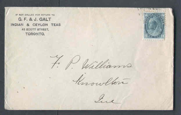#9783 - 1c Numeral-York County-Toronto,Ont- B/S Knowlton , Que - Au 19 1899 - CC "GF & J Galt Indian & Ceylon Teas" - 1c franking pays the printed matter letter rate