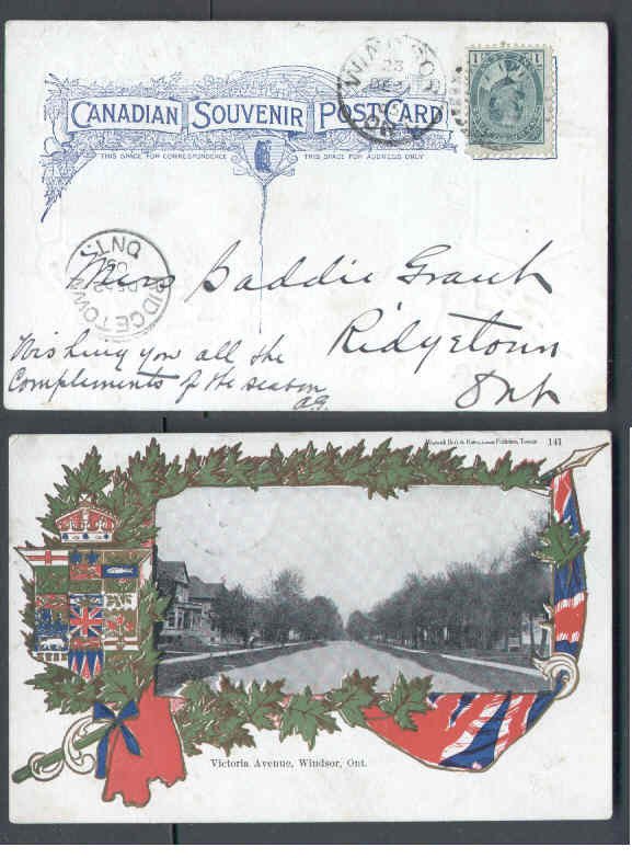 #9804 - 1c Edward patriotic p/c-"Victoria Avenue,Windsor,Ont"on reverse-Essex Cty-Windsor , Ont - De 21 1905 -
