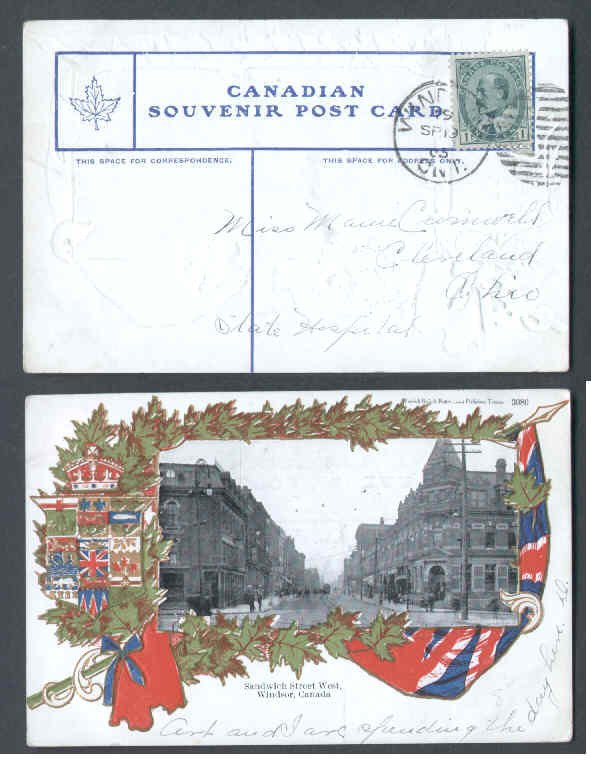 #9805- 1c Edward-patriotic p/c "Sandwich Street West,Windsor,Ont"on reverse-Essex Cty-Windsor,Ont duplex cancel [Don 1984] - Sp 19 1905