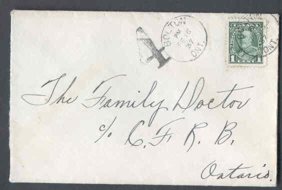 #9822 - 1c KGV pictorial short pays the 3c rate - Peel County - Bolton , Ont - Fe 16 1937 - H/S "4" , for double the deficiency of 2cÂ