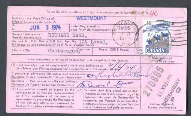 #9844 - 15c Mountain Sheep on AR card - Montreal , PQ - 3 VI 1974 - 15c franking pays the fee for the Acknowledge of Receipt card for registered mail