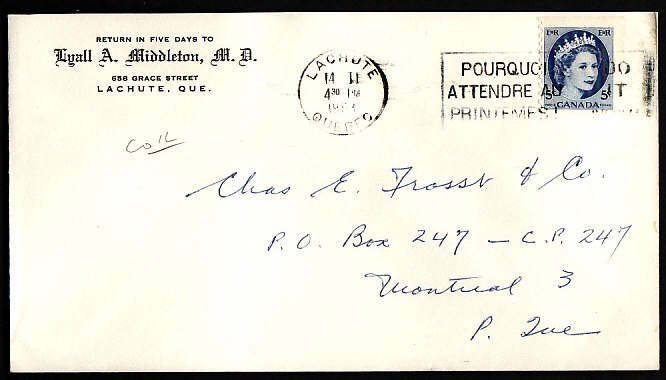 #9938 - 5c QEII Wilding coil- Lachute , Quebec-14 II 1963 -CC "Lyall A Middleton MD"Member of the Canadian Stamp Dealers Association and have been serving the collector since 1975.Canadian buyers - I will cover your GST/HST costs .Â